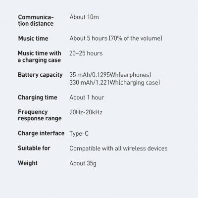 Playback time: about 5h (70% of the volume), 20~25h (with charging case)
